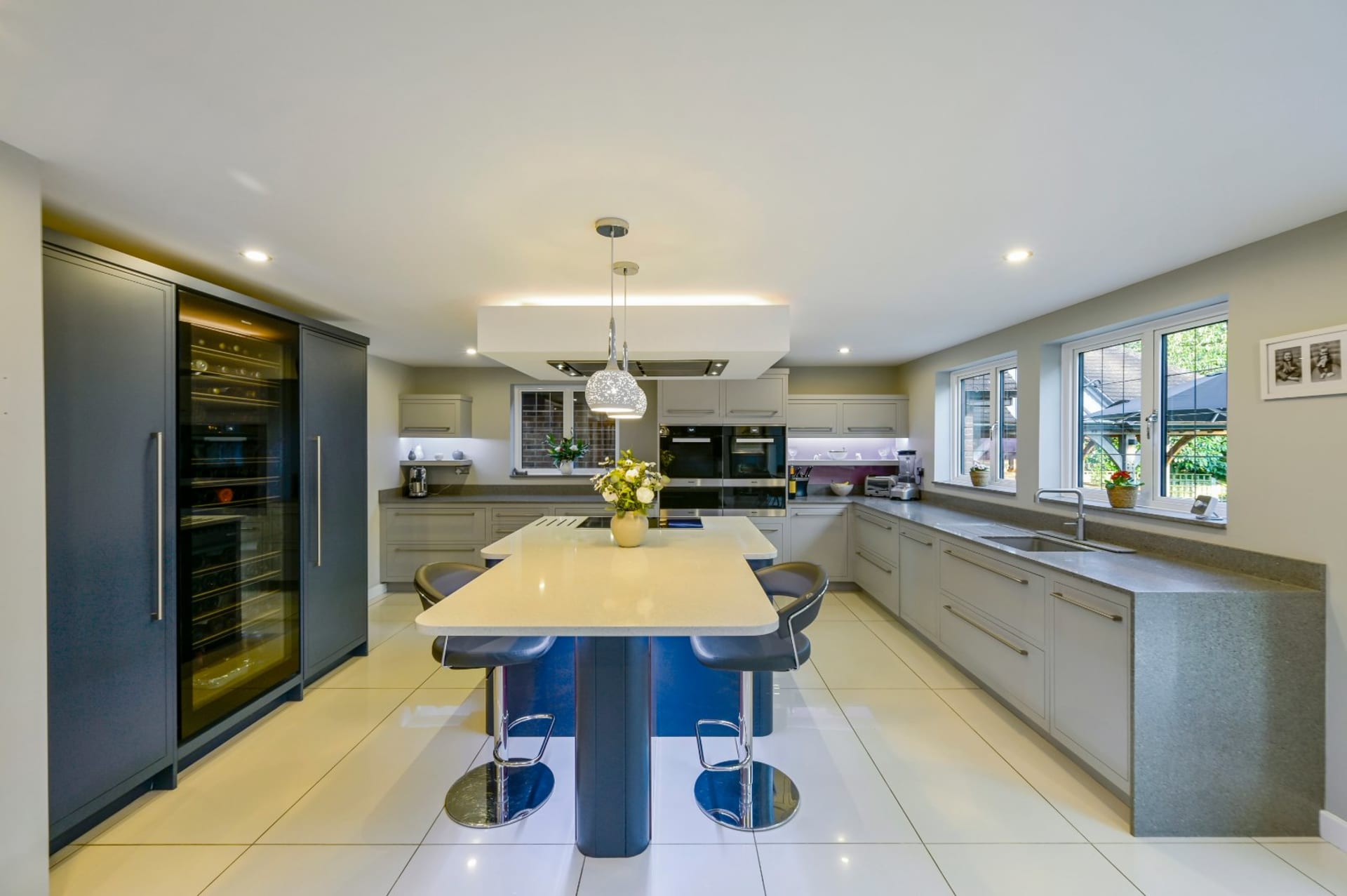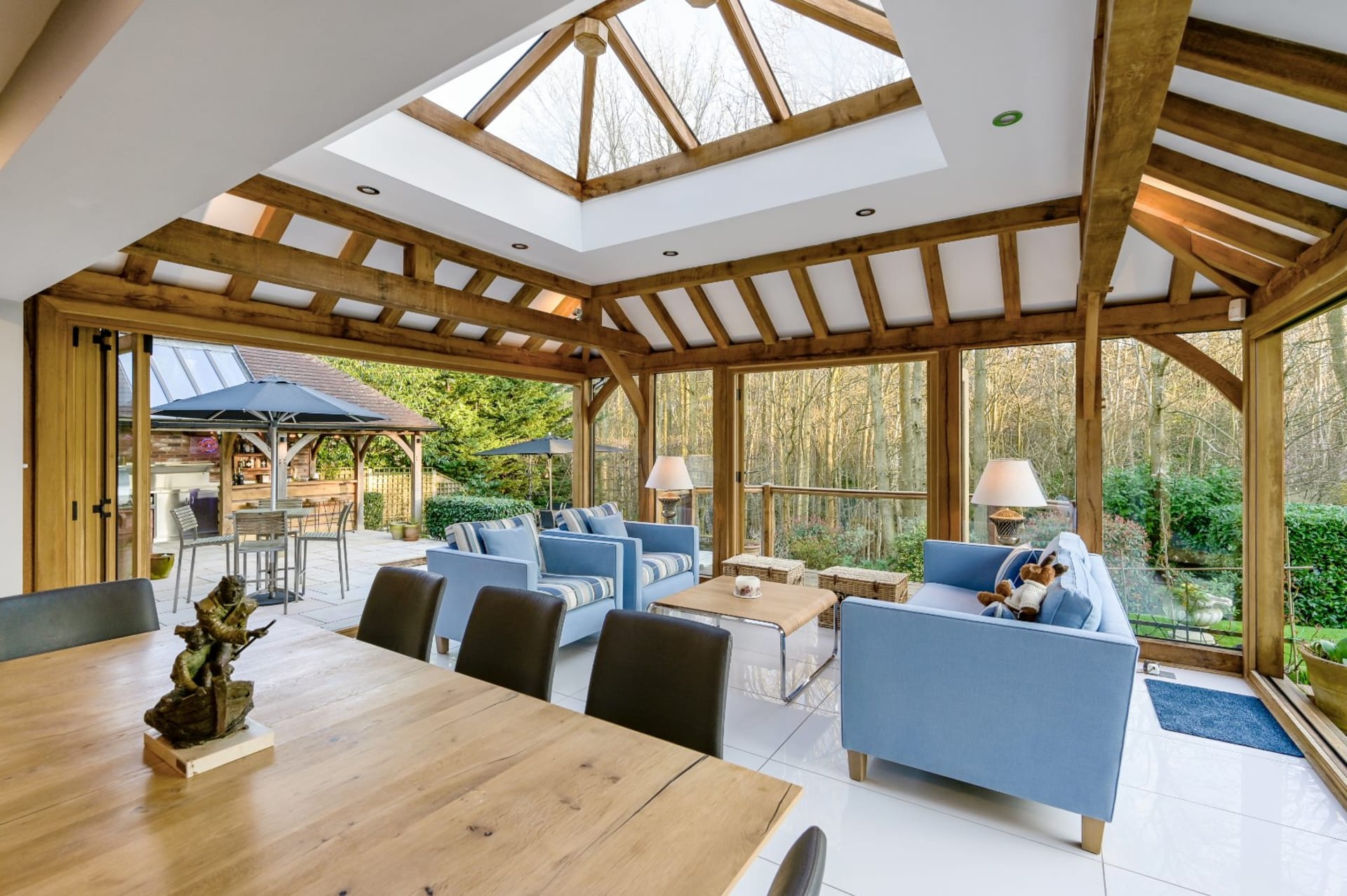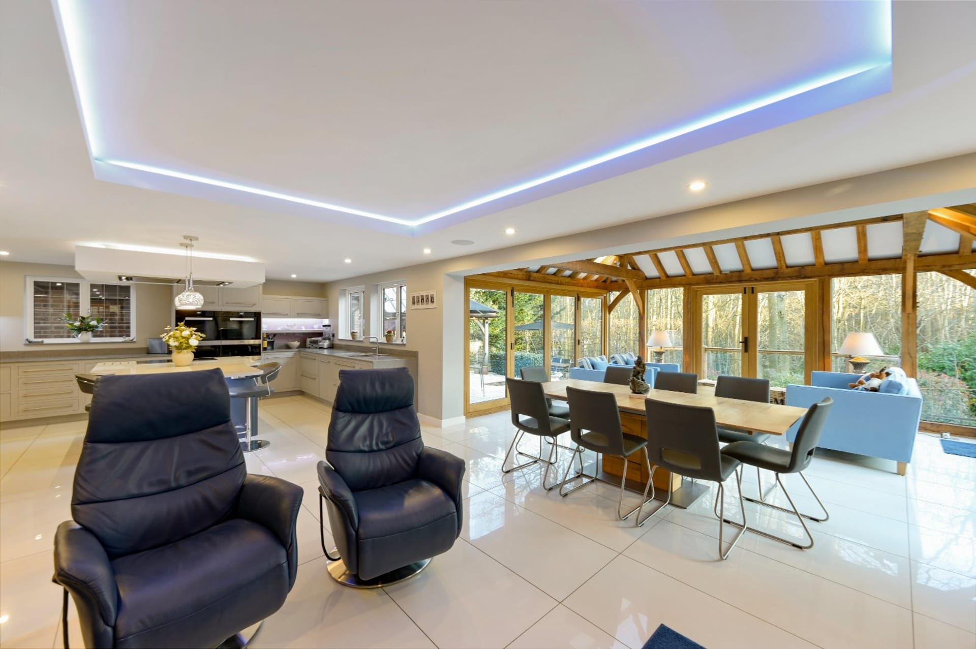 - Spectacular orangery extension with twin bifold doors, Harvey Jones kitchen with Miele appliances, Neville Johnson fitted dressing room.