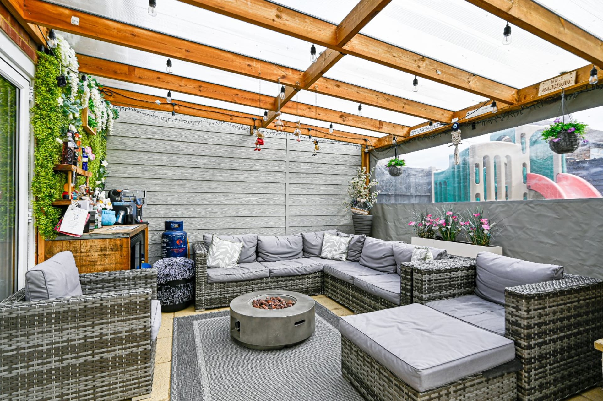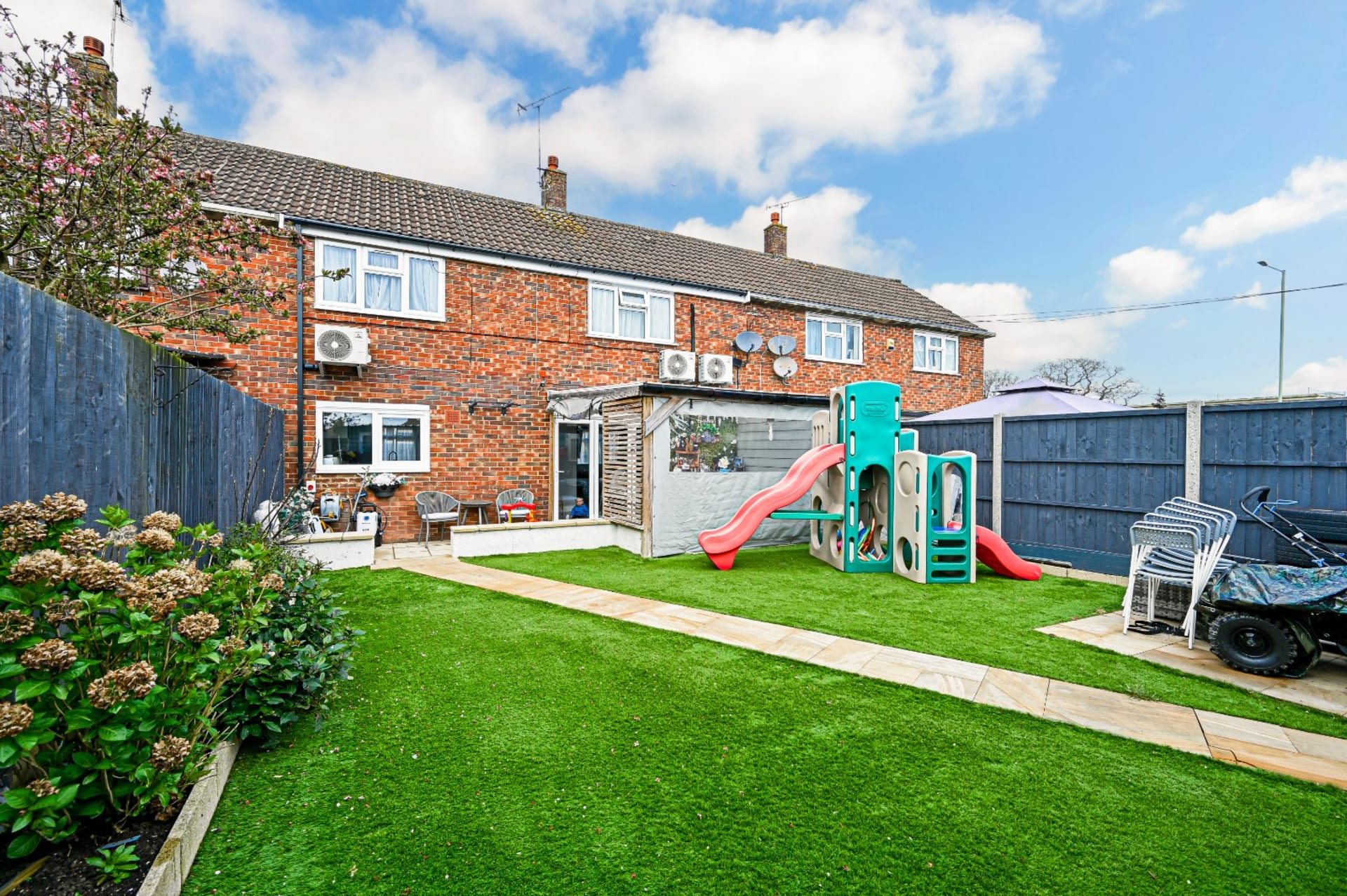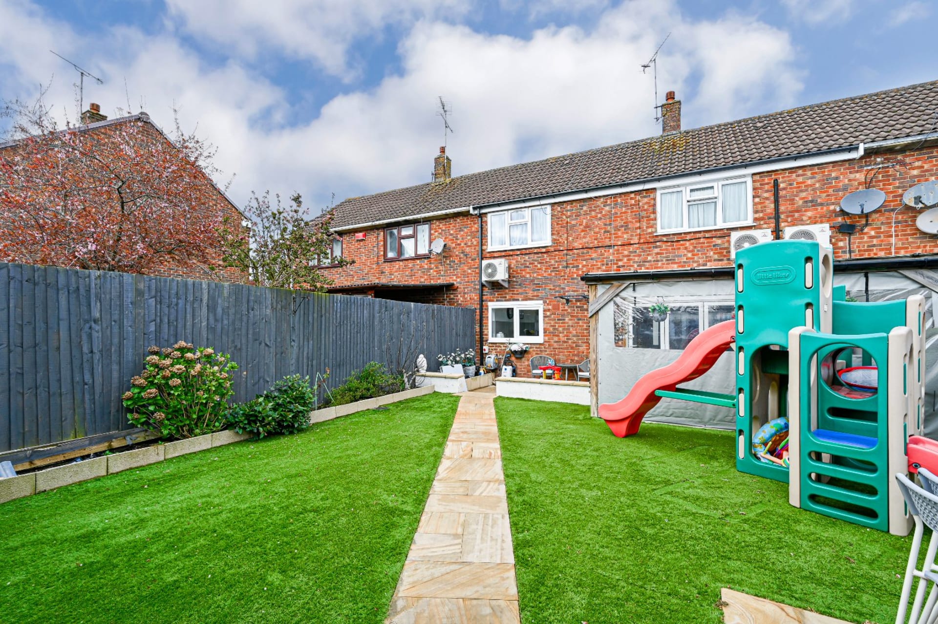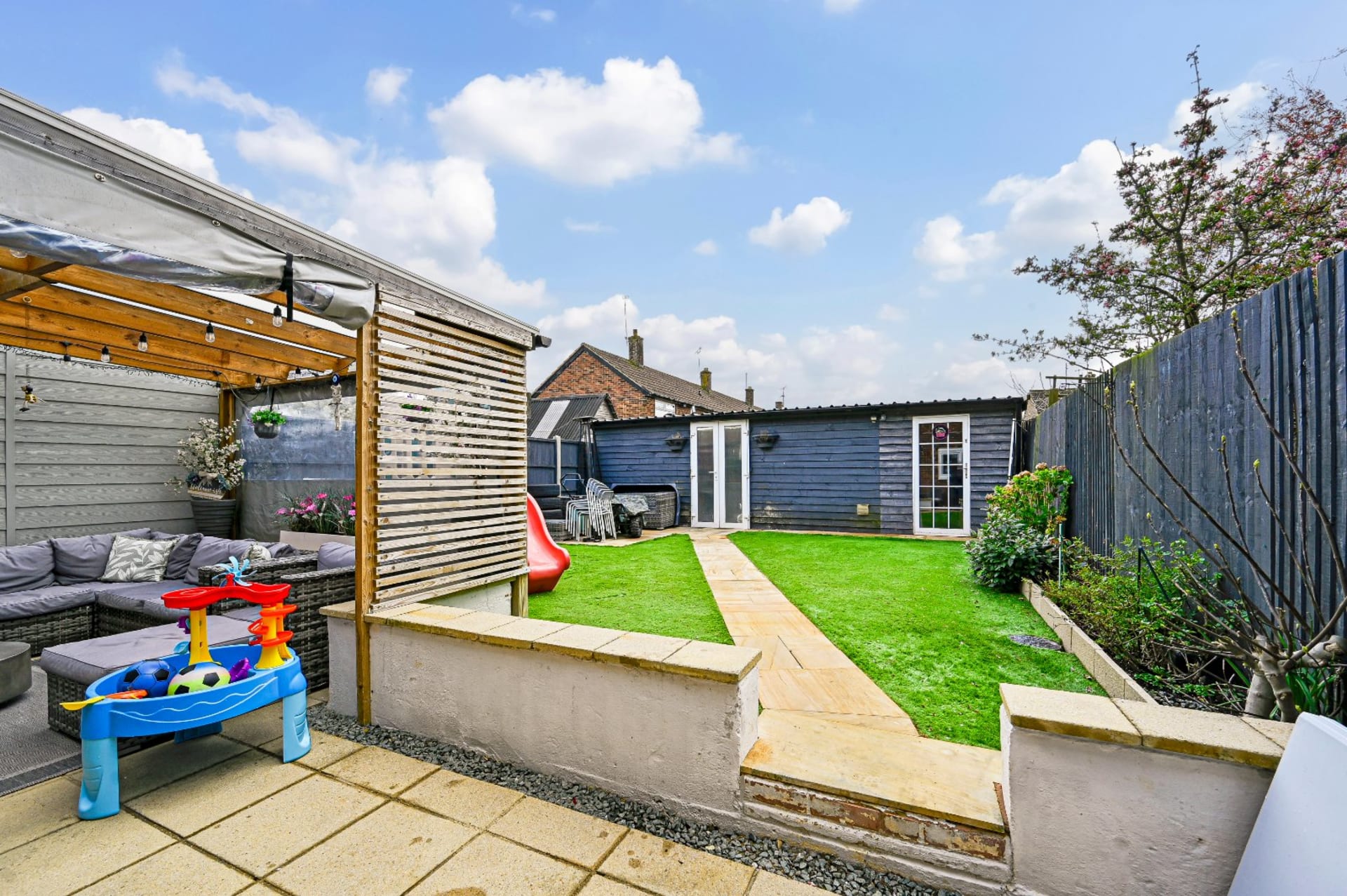 - Landscaped garden with covered patio and artificial lawn