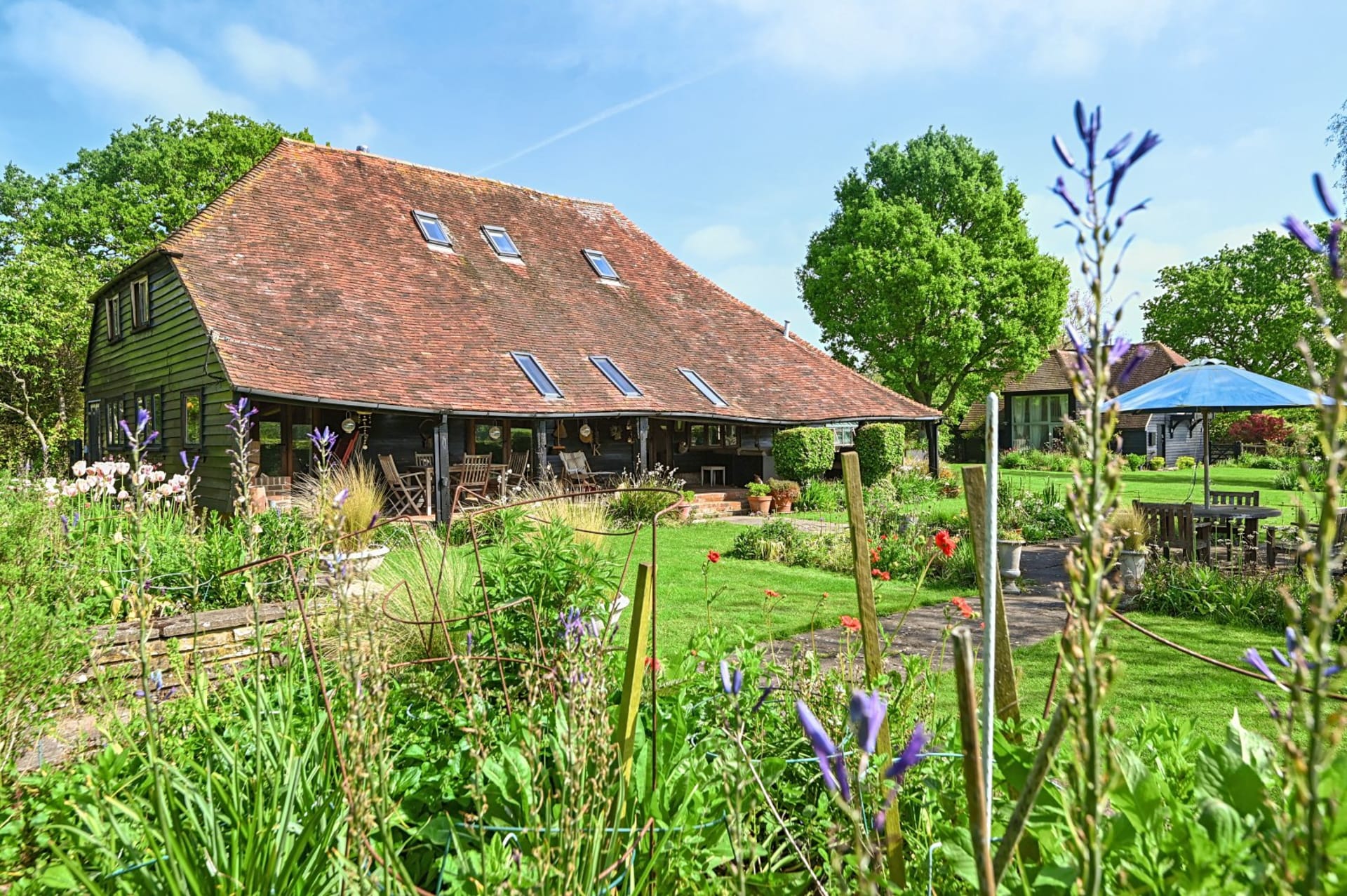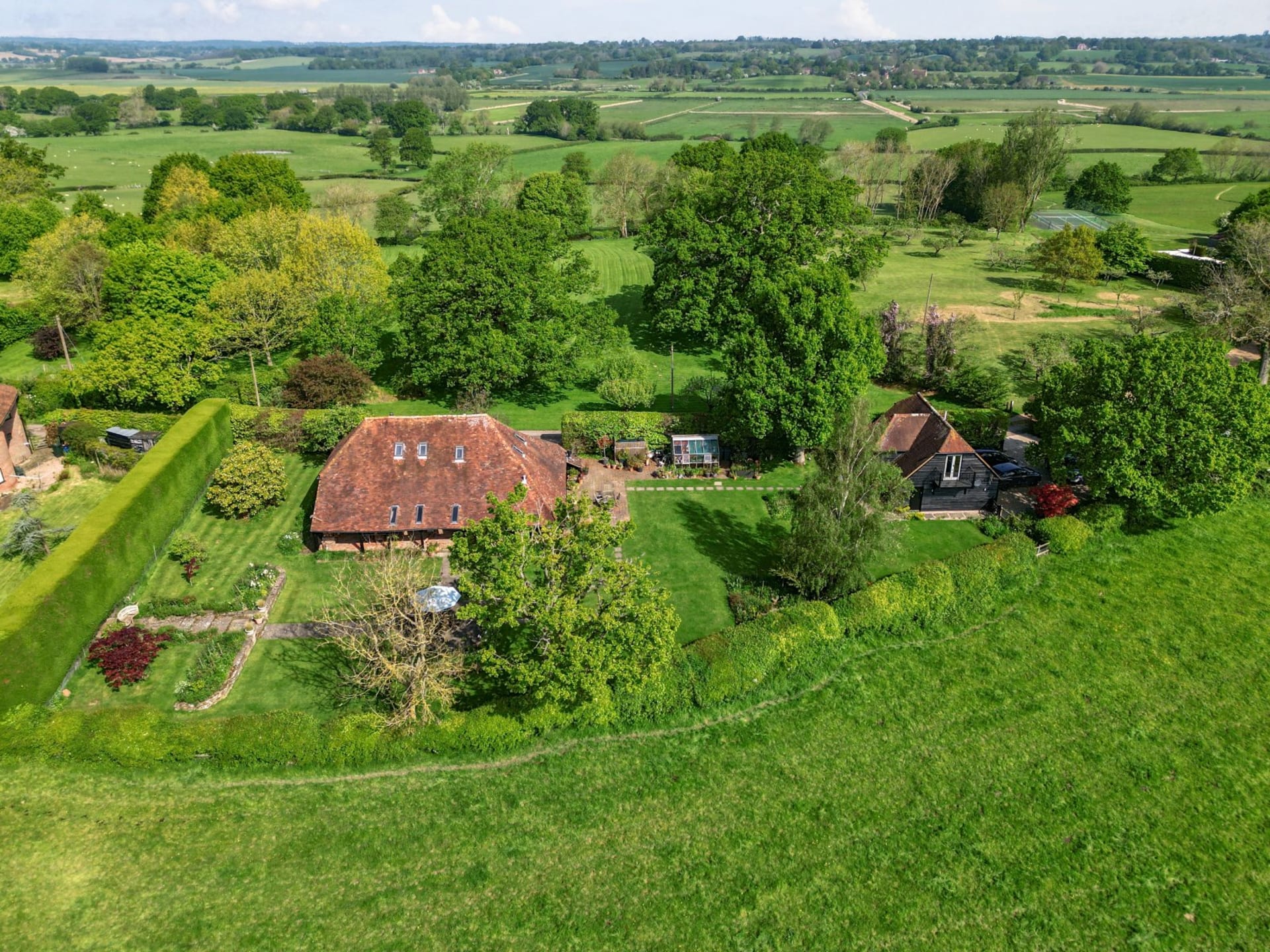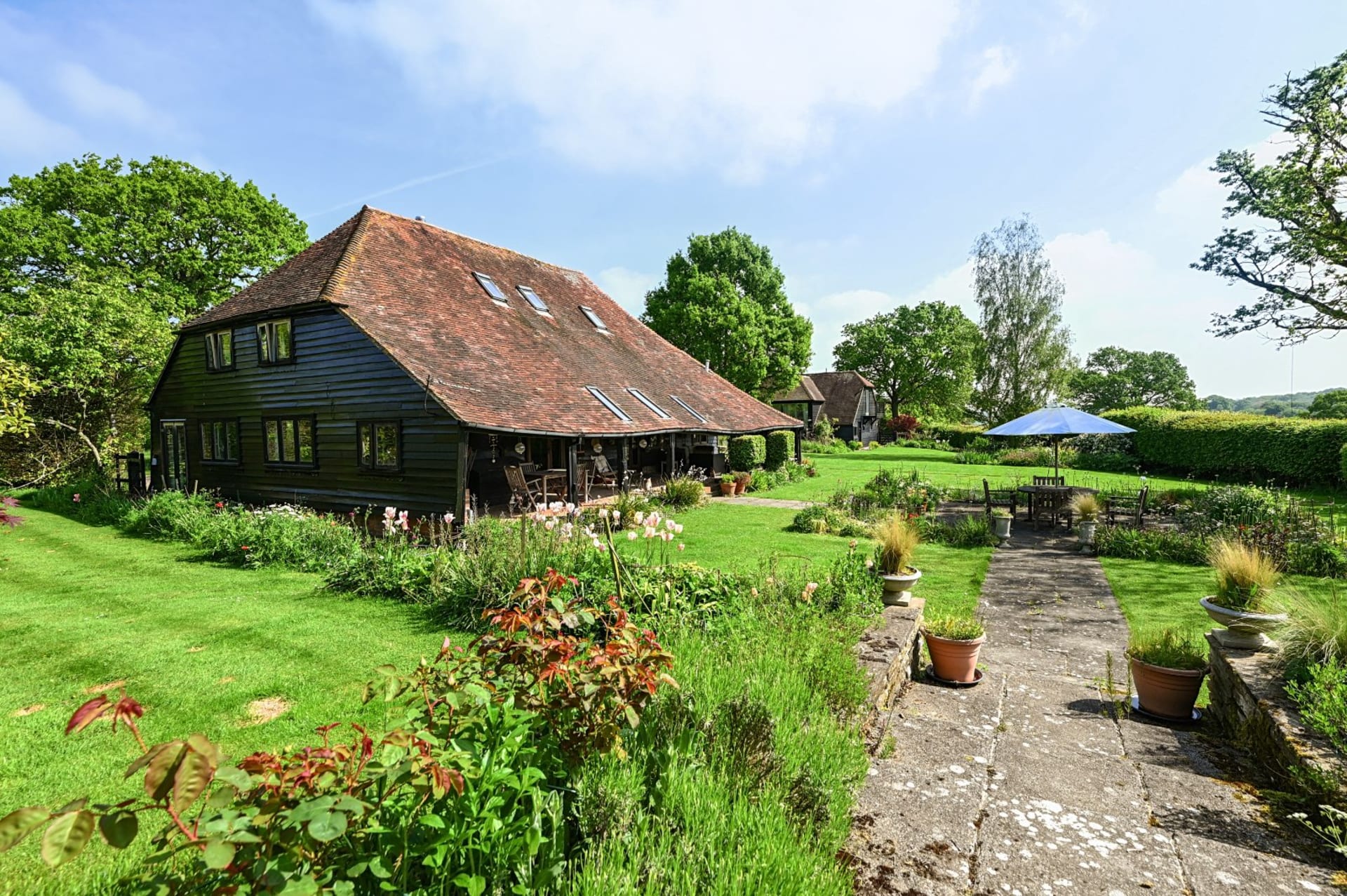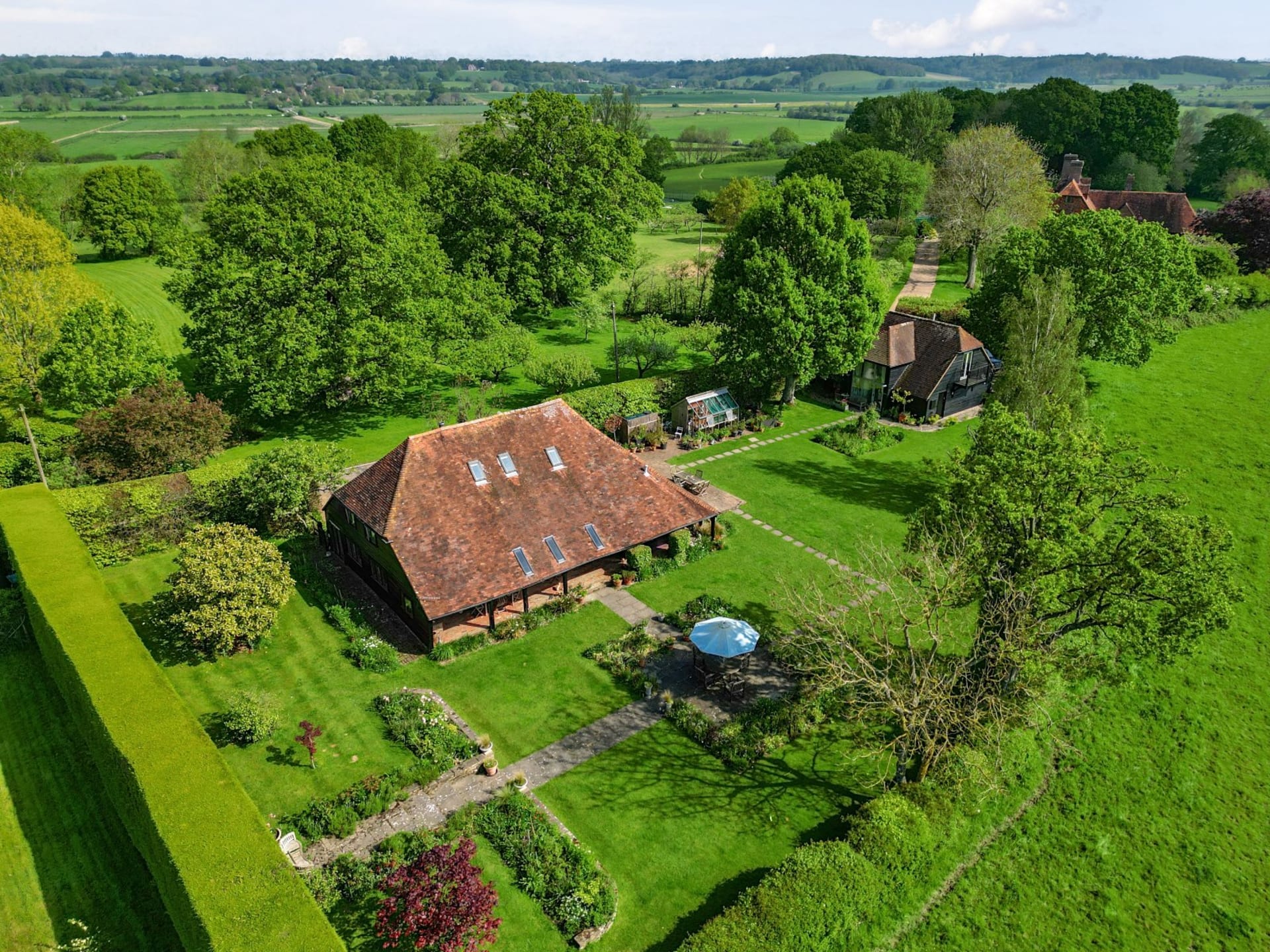 An impressive unlisted detached barn with versatile living accommodation and wonderful loggia, plus the addition of an attractive detached 2 bedroom annexe, all set in glorious gardens and land/fields of just under 3 acres. Situated in a quiet secluded location within the High Weald National Landscape Area with spectacular uninterrupted countryside views. In all 2.93 acres No onward chain