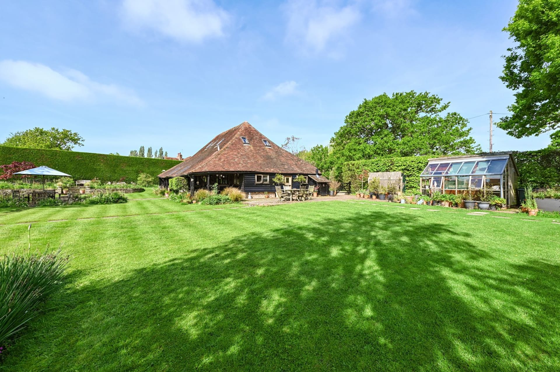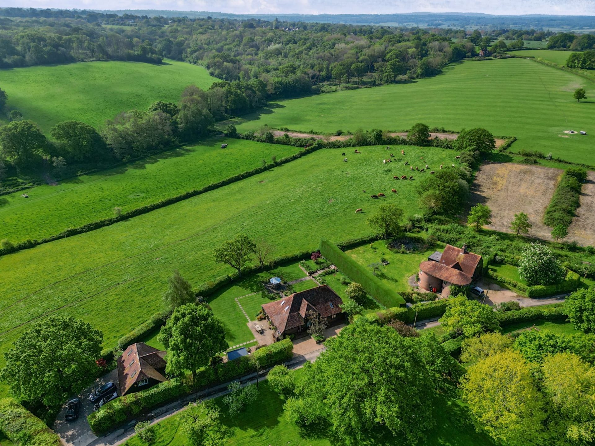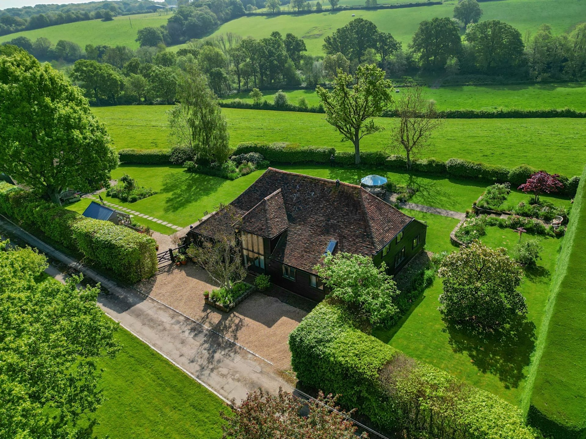 An impressive unlisted detached barn with versatile living accommodation and wonderful loggia, plus the addition of an attractive detached 2 bedroom annexe, all set in glorious gardens and land/fields of just under 3 acres. Situated in a quiet secluded location within the High Weald National Landscape Area with spectacular uninterrupted countryside views. In all 2.93 acres No onward chain