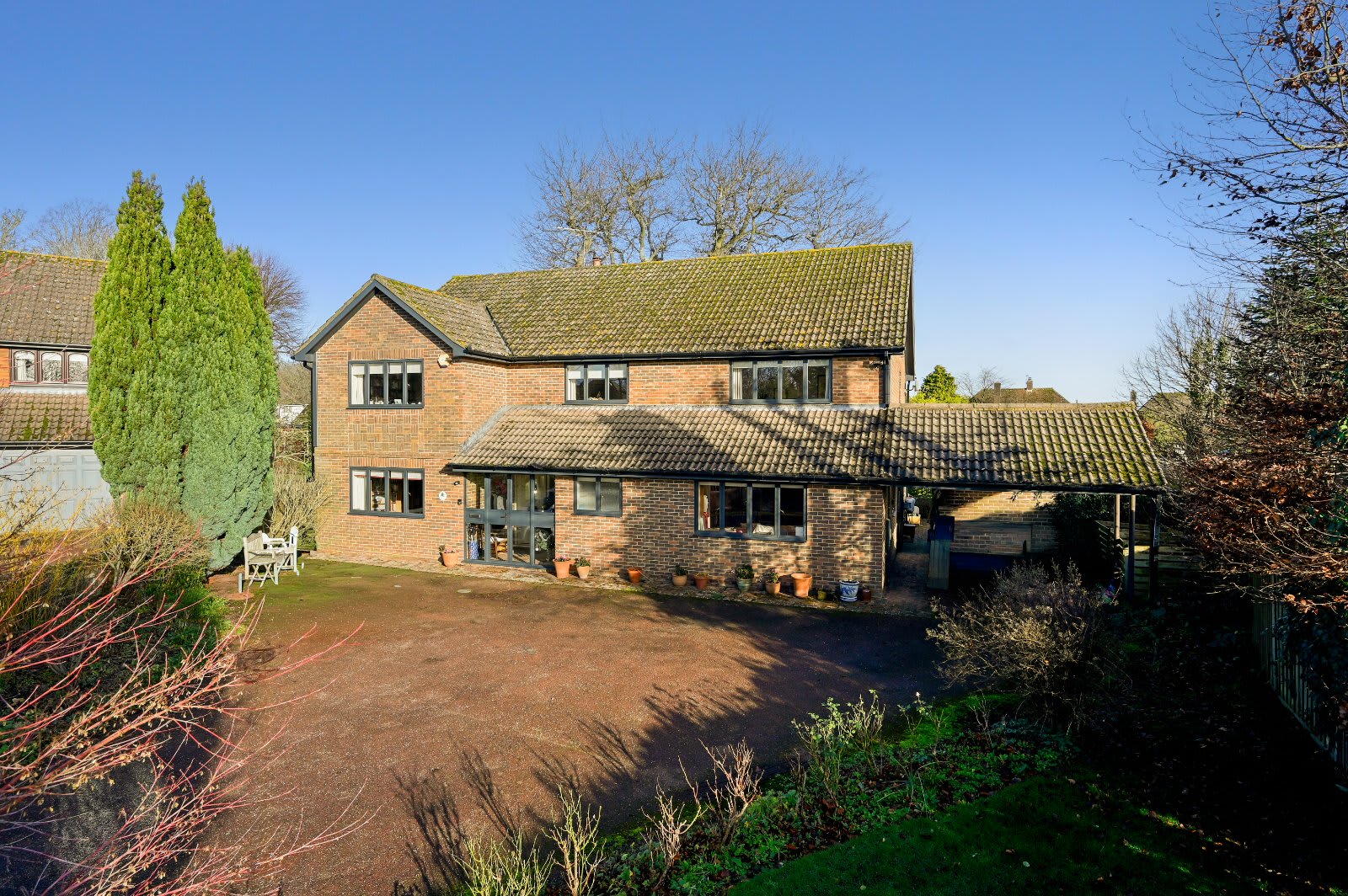 - Generous plot size with large enclosed gardens, oversize garage, and driveway parking for several cars.