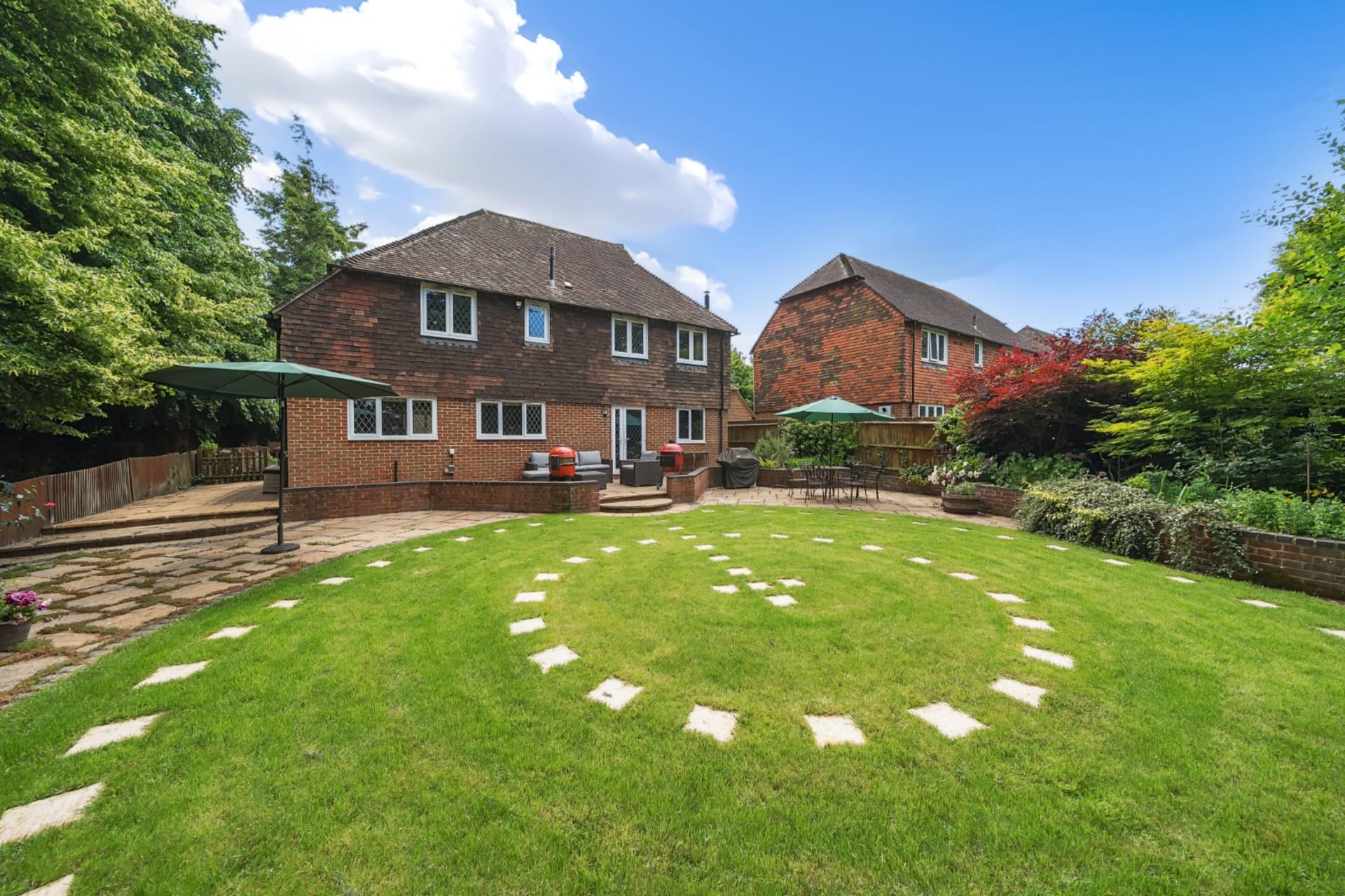 - Landscaped Gardens: Private rear garden with a paved terrace, circular lawn, mature borders, and scenic views of adjacent green space with oak trees.