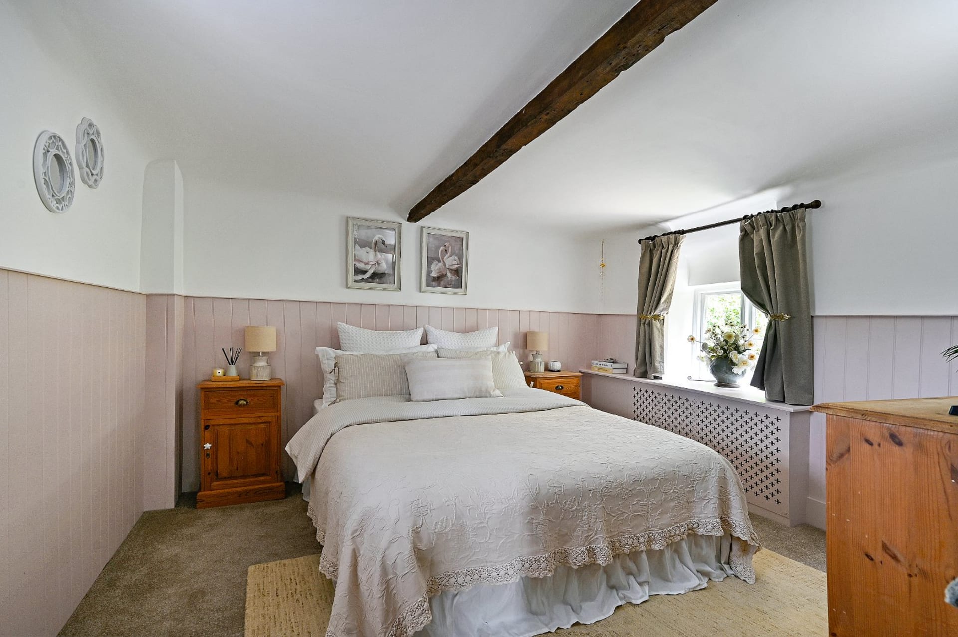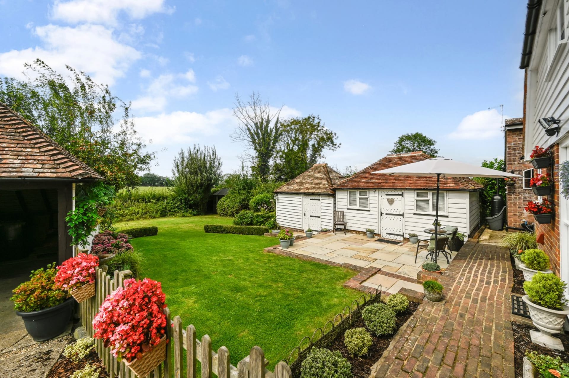 A compact and characterful Grade 2 listed detached house with 3 bedrooms (1 double and 2 singles), beautifully styled and set within delightful mature gardens and surrounded by farmland in a quiet country lane, with a double cart barn, log store room, and outside home office.