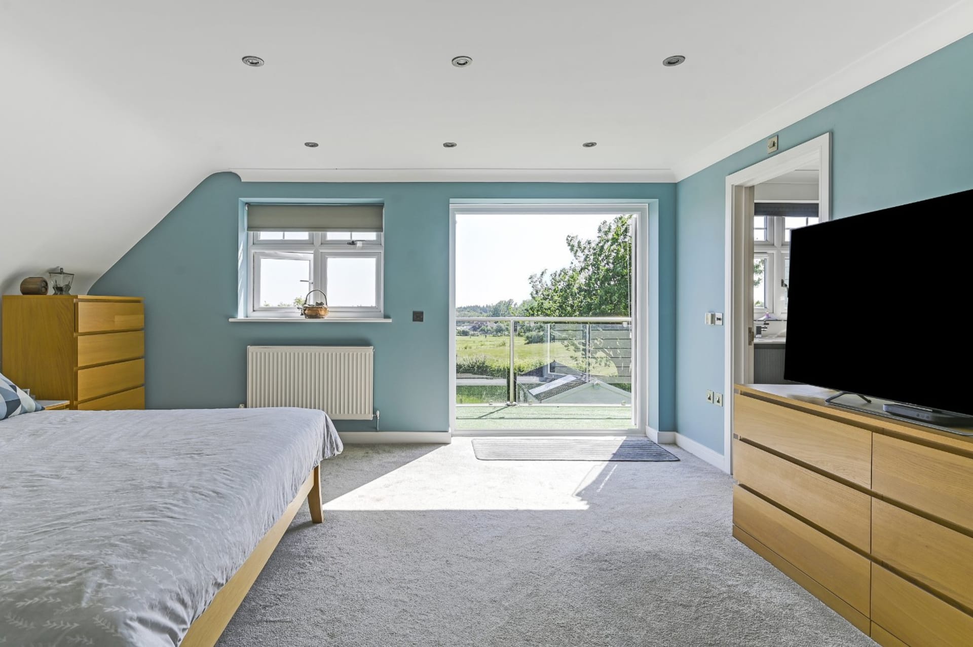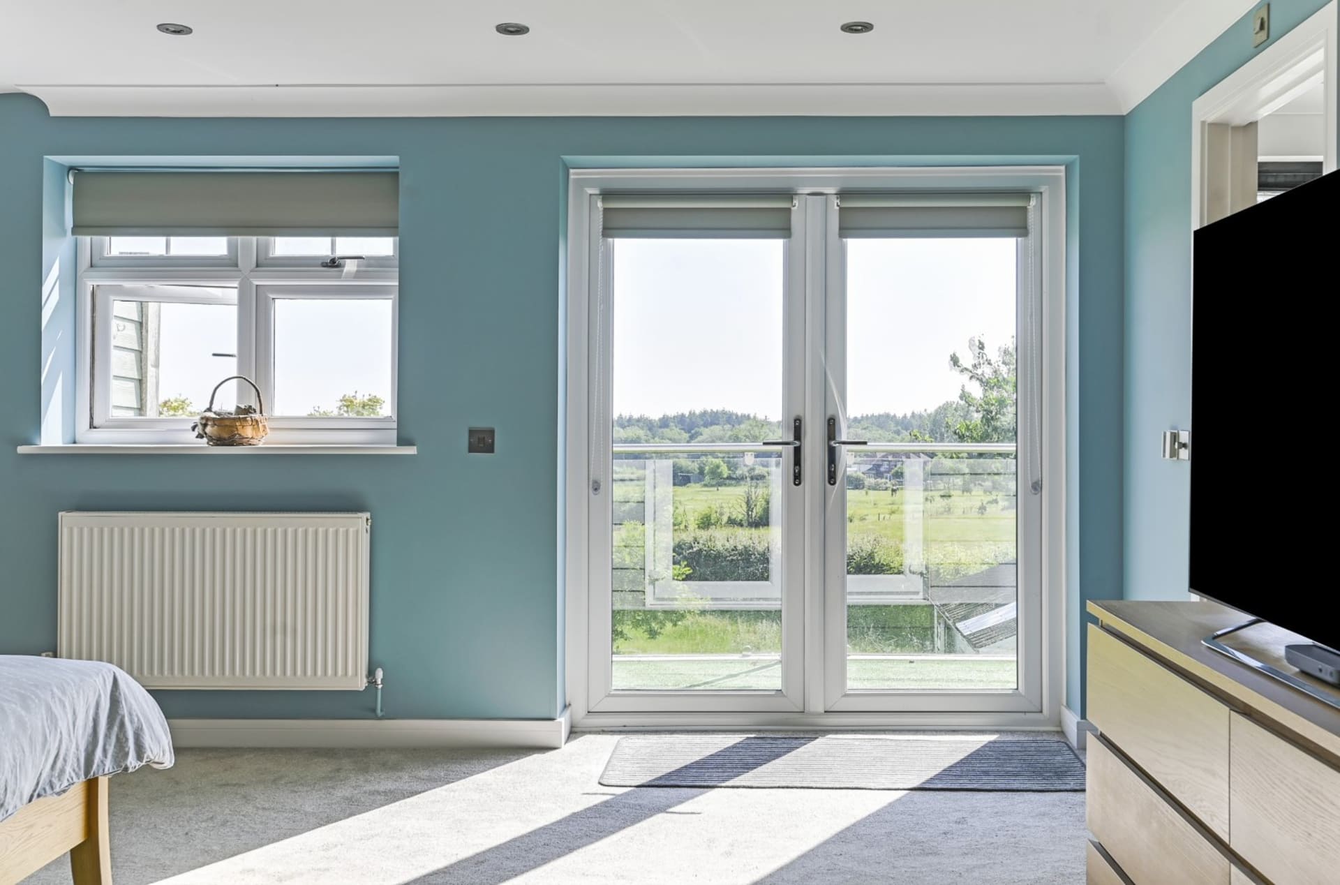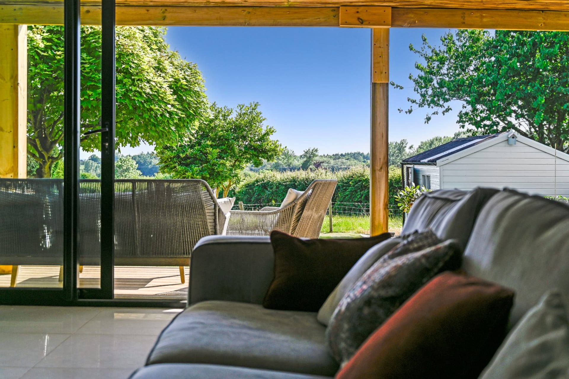 A Striking Contemporary Home with Glorious Countryside Views. Set amidst unspoilt rural surroundings, this distinctive and beautifully presented chalet-style home offers a wonderful blend of contemporary design and generous open-plan living, arranged over two floors with thoughtfully considered architectural details throughout. One of the home’s most notable features is the full-width, glazed ground-floor elevation which floods the principal reception space with natural light, while the superb principal bedroom suite enjoys direct access to a substantial private balcony – a perfect spot from which to take in the far-reaching views across surrounding farmland.
