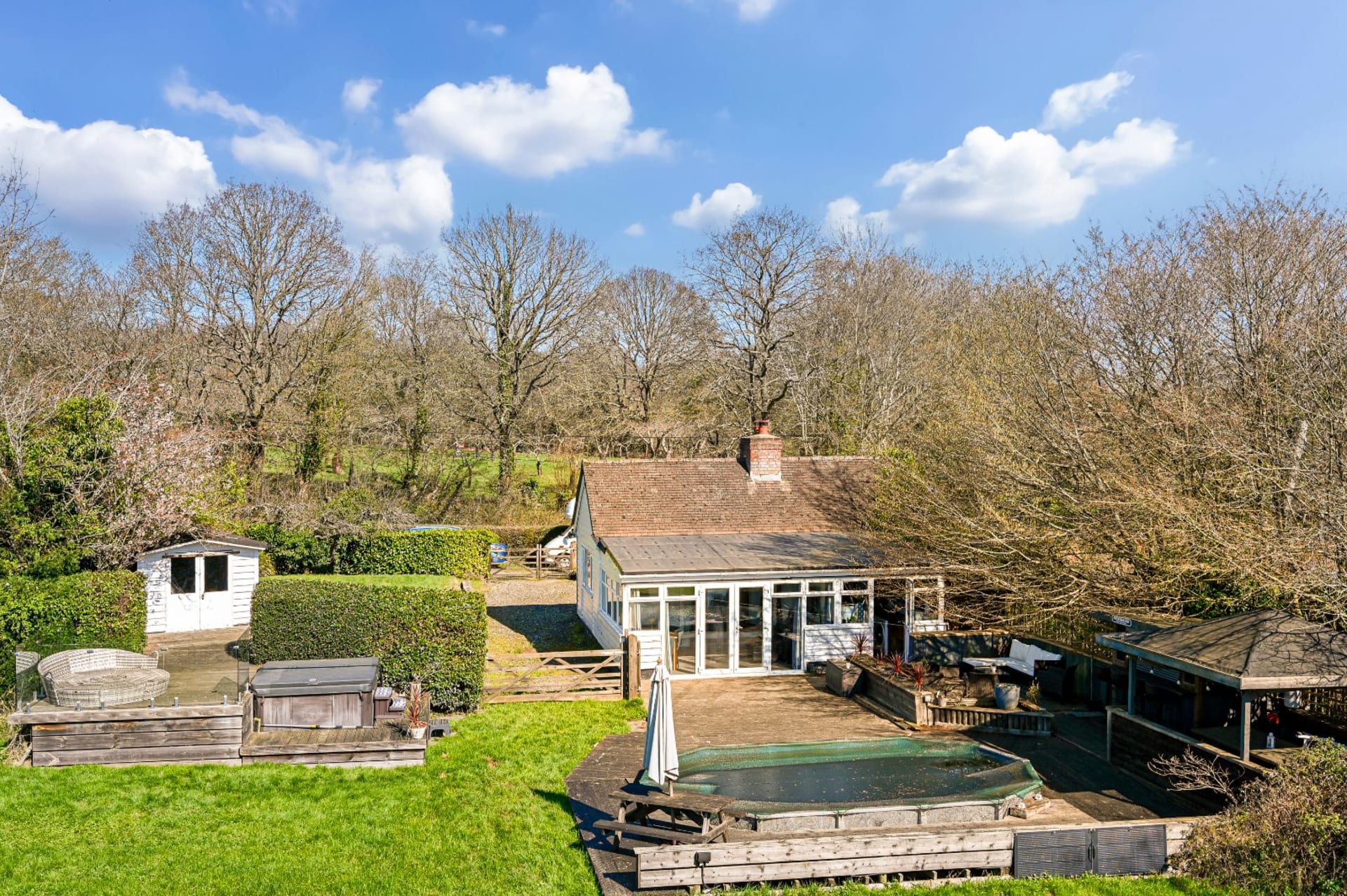 A unique detached single storey property with flexible and spacious living accommodation, set down a quiet country lane, with generous size gardens of about 0.56 of an acre and with an outdoor dining area/bar, pool, and 2 sheds. There is off road parking for several cars and wonderful countryside walks. A short distance to Benenden village with local pub, shop and café, and within the Cranbrook School catchment area.